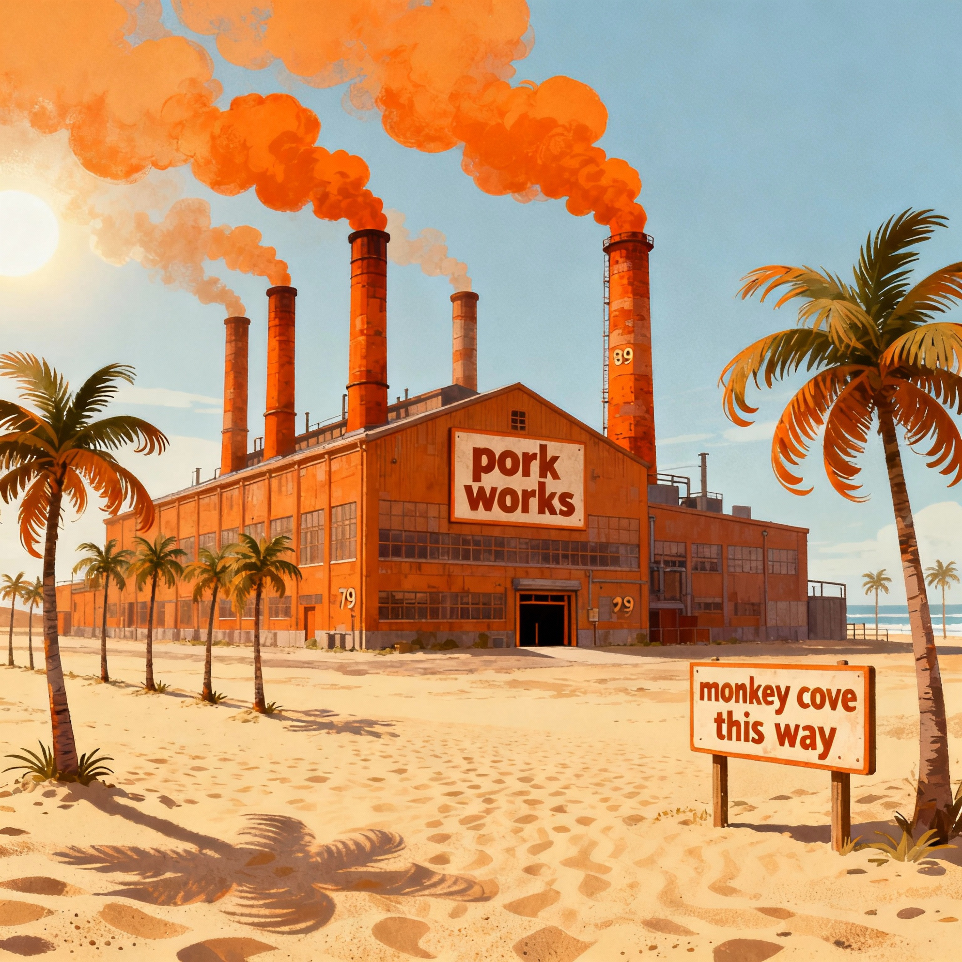 The Pork Works is the heart of Chow Island’s industrial and clandestine economy—a vast, mechanized complex dedicated to processing and converting raw materials into the island’s signature addictive pork lozenges. Situated in the shadowed valleys beneath the island’s volcanic spires, the facility functions as a highly efficient bioreactor where methane harvested from the bull pens fuels hyper-advanced machinery, including the infamous Chow Chipper. Here, organic waste and other materials are broken down with surgical precision to generate energy and key ingredients that sustain both the lozenge production and Chow Island’s unyielding control mechanisms. It is a place where biology, technology, and dark commerce intertwine, embodying the island’s paradox of opulence built on a foundation of relentless industrial power and secrecy.